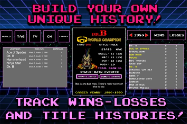 Alami tahap simulasi yang tidak pernah berlaku sebelum ini dengan ciri-ciri pengesan statistik yang lengkap. Jejaki setiap kemenangan dan kekalahan ahli gusti anda, rekod sejarah kejuaraan untuk setiap tali pinggang juara anda, dan saksikan anugerah akhir tahun yang berprestij. Kedalaman dan ketepatan ini menjadikan 80s Mania Wrestling Returns sebagai simulator gusti terbaik di kalangan semua permainan gusti mudah alih yang ada, menawarkan pengalaman pengurusan yang sungguh mendalam dan memuaskan.
