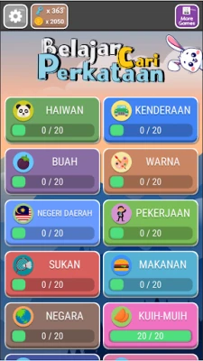 Dengan lebih 20 tahap permainan yang direka teliti, setiap satu menjanjikan cabaran baru yang segar, memastikan anda tidak akan bosan. Koleksi lebih 1000 perkataan yang luas menanti untuk ditemui, dikelompokkan dalam lebih daripada 20 kategori yang pelbagai dan menarik. Terokai senarai kata dari alam 'Haiwan' dan 'Buah-Buahan' yang biasa kita temui, selami istilah dari 'Pekerjaan' atau 'Benda' di sekeliling kita, hingga ke nama-nama 'Negara' dan 'Negeri / Daerah' yang membentuk geografi kita. Malah, terdapat kategori istimewa seperti 'Palindrome' yang akan menguji kepekaan anda, bersama-sama dengan kategori 'Sekolah', 'Keluarga', 'Makanan' dan banyak lagi yang pasti memancing minat.