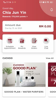 Kami menghargai kesetiaan anda dengan program ganjaran yang menarik. Tukarkan mata CUCKOO+ terkumpul anda untuk menebus pelbagai ganjaran eksklusif, dari diskaun istimewa hingga produk CUCKOO terbaru, semuanya disesuaikan khas untuk anda. Untuk ketenangan fikiran yang maksimum, fungsi pengesahan QR membolehkan anda mengesahkan identiti kakitangan servis yang berkunjung, menjamin keselamatan dan profesionalisme. Dan untuk sebarang pertanyaan atau bantuan, pembantu AI kami sentiasa bersedia 24/7, menawarkan sokongan pantas dan cekap bila-bila masa anda perlukannya.
